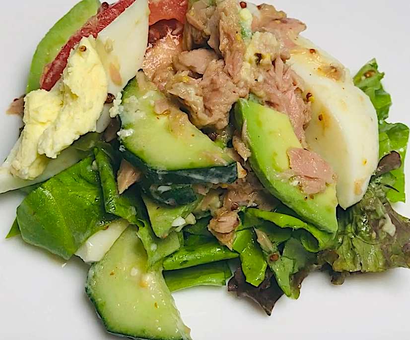 Салат с тунцом, яйцом и авокадо Листья салата Консервированный тунец 1 банка Огурец 1 шт Помидоры 1 шт яйца 2 шт авокадо 1 шт Для соуса оливковое масло лимонный сок мед соевый соус соль, перец Нарезаем листья салата, авокадо, яйца, огурец, помидоры, Добавляем консервированный тунец, соус, соль, перец и перемешиваем. Салат с тунцом, яйцом и авокадо готов.