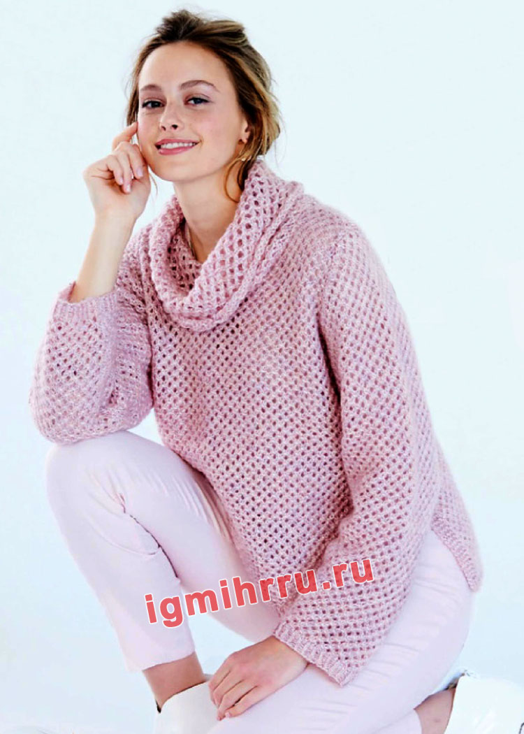 СВОБОДНЫЙ РОЗОВЫЙ ДЖЕМПЕР С СЕТЧАТЫМ УЗОРОМ. Размеры российские: 44/46 (48) 50/52Вязание спицами