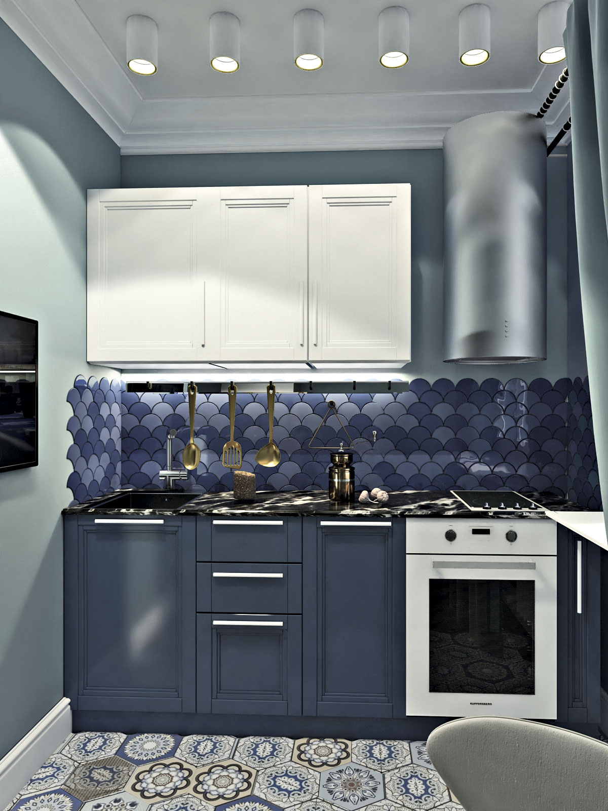 Есть мнение, что темные цвета съедают пространство и в них становится очень тесно, но на примере этой темно-синей кухни становиться понятно, что главное в темных цветах - это правильно сочетать их со светлыми оттенками.