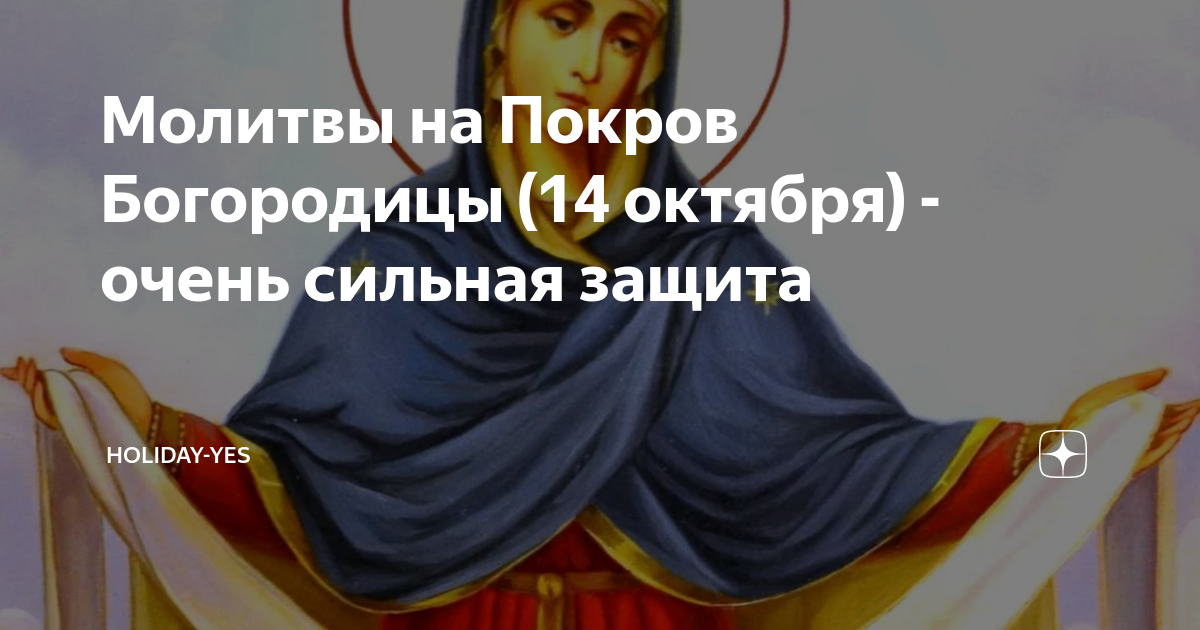 Молитвы на Покров Богородицы (14 октября) - очень сильная защита 14 октября все православные верующие отмечают великий праздник Покров Пресвятой Владычицы нашей Богородицы и Приснодевы Марии. В этот день и ночь молимся Богородице о том, что важно в жизни для нас. Также отдаем дань уважения своей молитвой. Источник: Яндекс Как много в церковном календаре праздников, но, признаю честно, моим самым любимым является Покров.: Во-первых, потому что Богородица для
