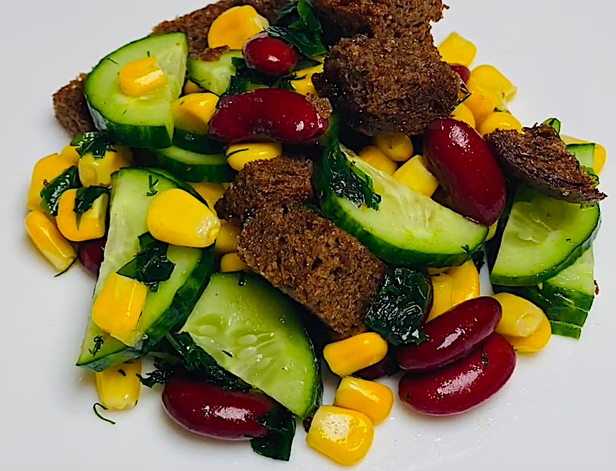 Ингредиенты:Черный хлебКонсервированная кукурузаКонсервированная красная фасольОгурецЗеленьЧеснокОливковое масло