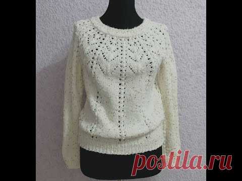 МК 1 подробный для начинающих Джемпер женский спицами без швов с ажурной кокеткой, реглан сверху