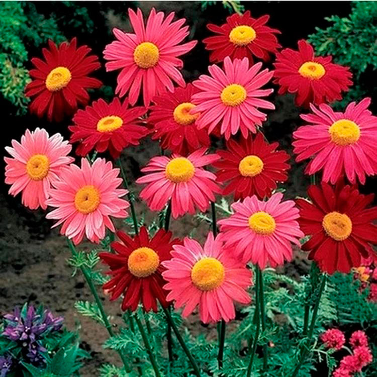 Многолетний садовый цветок Пиретрум (Pyrethrum). Семейство: сложноцветные (Compositae). Многолетнее травянистое растение с крупными ромашковидными цветками различных окрасок и продолжительным цветением. Стебель малооблиственный, высотой до 1 м, листья перисторассеченные. Цветет в июне - июле. Основные виды К многолетним видам относятся: п.розовый (P.roseum) - высотой 60-75 см; прикорневые ажурные листья образуют розетку; соцветия диаметром до 7-8 см, простые, полумахровые или махровые.