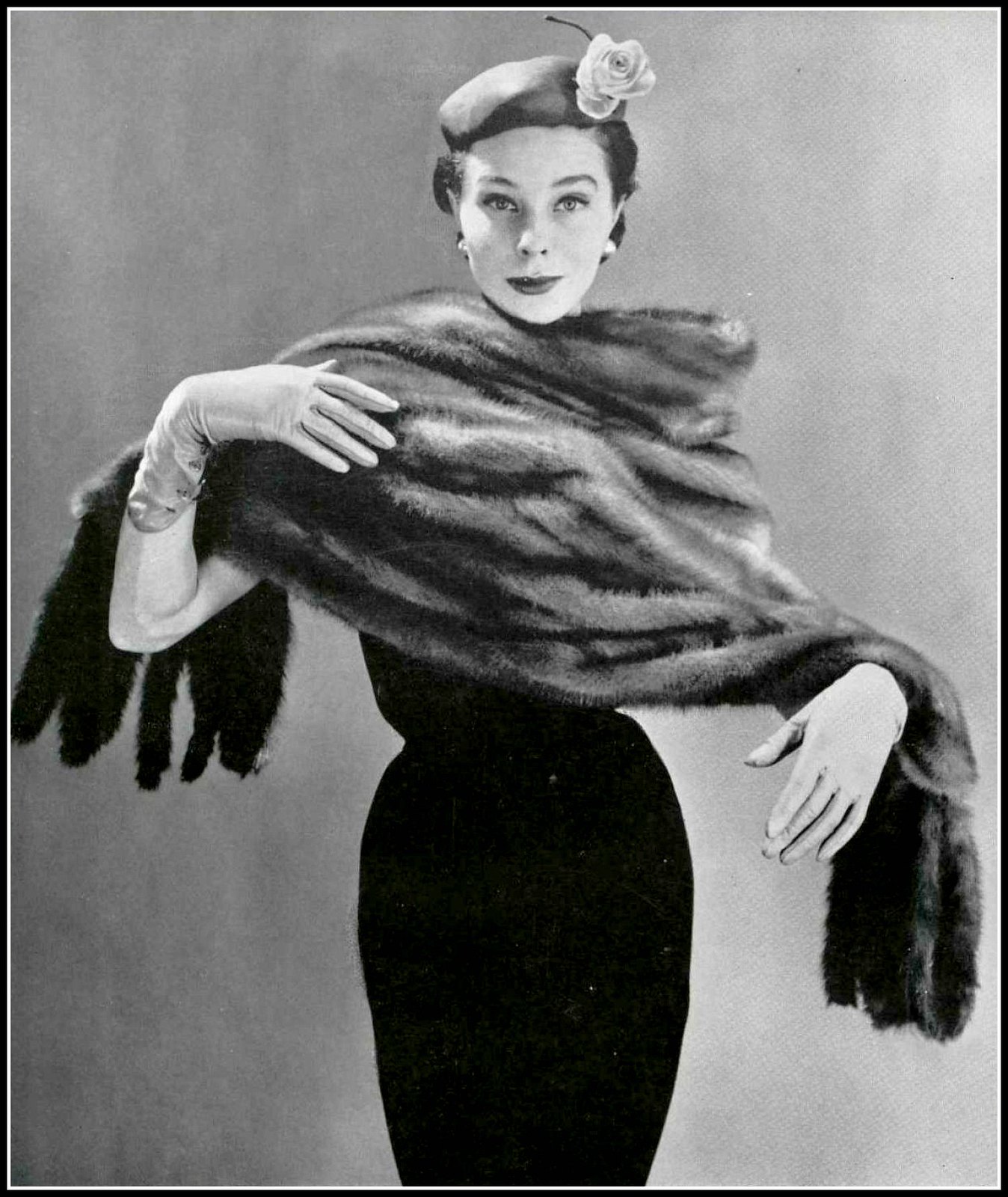 Bettina in Royal Pastel fur stole by Stoll Furs, hat by Svend, photo by Gene Fenn, 1953