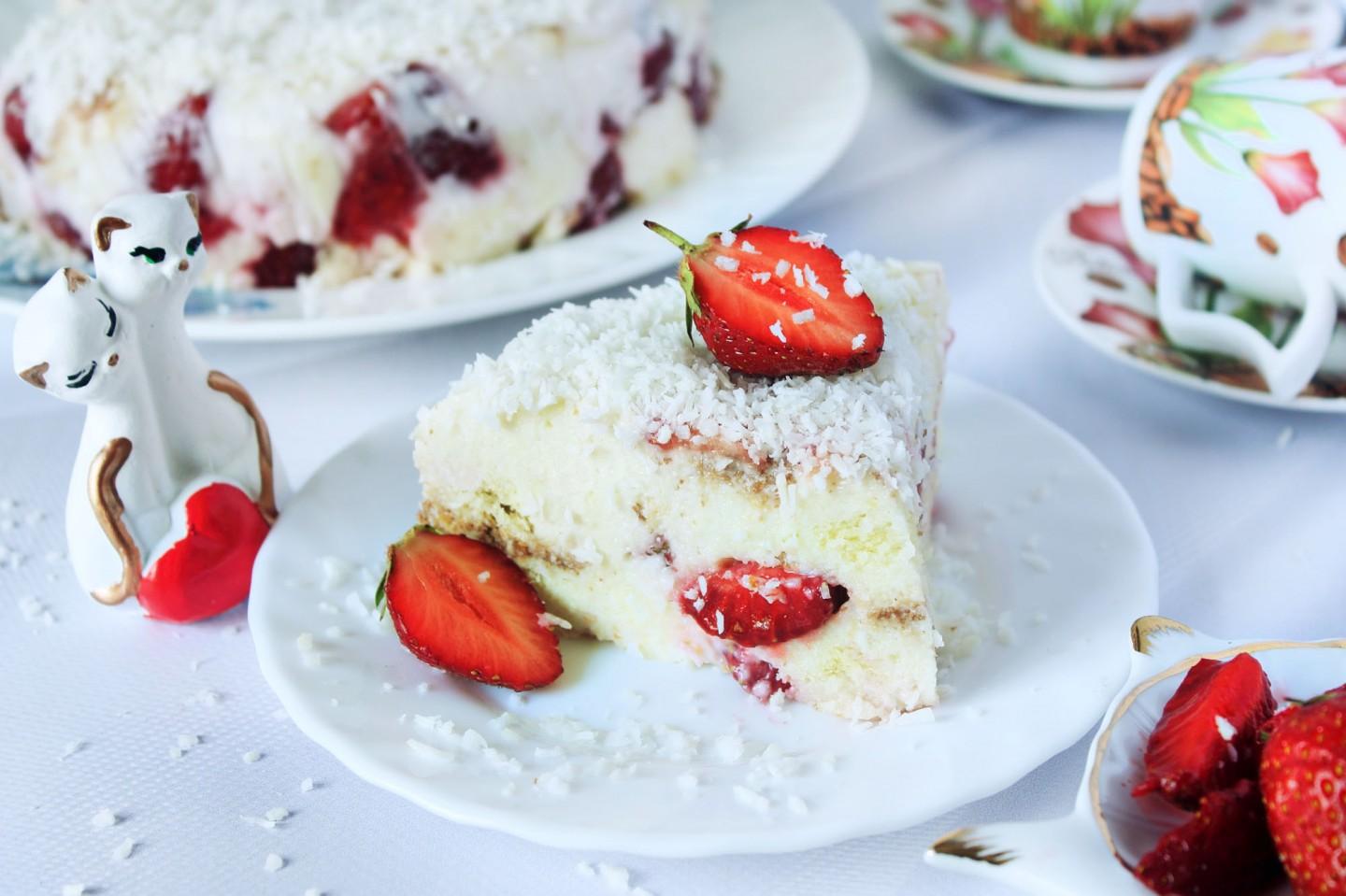 - Шаг 1: Готовим бисквит. Вбиваем в миску яйца и всыпаем сахар. Взбиваем миксером 10 минут, постепенно увеличивая скорость. Масса должна побелеть и увеличиться в 3 раза.Шаг 2: Всыпаем просеянную муку и аккуратно вводим ее в тесто движениями сверху вниз при помощи силиконовой лопаточки. Тесто готово.Шаг 3: Дно формы для выпечки застилаем пергаментой бумагой и выливаем тесто.Шаг 4: Выпекаем бисквит в духовке при 180 градусах 25 минут. У меня корж получился высокий, так что я пекла немного дольше - готовность проверила с помощью зубочистки. Готовому бисквиту даем настояться 2 часа.Шаг 5: Клубнику моем и режем вдоль на 4-6 частей, в зависимости от размера.Шаг 6: Желатин замачиваем в холодной воде на 30 минут. Это можно сделать в тот момент, пока тесто находится в духовке.Шаг 7: Сметану смешиваем с сахаром и вливаем желатин, который после набухания нужно подогреть до полного растворения - но ни в коем случаем не доводить до кипения, иначе он не застынет. Все перемешиваем.Шаг 8: Бисквитный корж нарезаем на крупные квадратики и пересыпаем в миску. Вливаем в него половину сметанной заливки и перемешиваем.Шаг 9: Форму застилаем пищевой пленкой. На дно формы можно положить кусочки клубники в качестве рисунка, который при переворачивании торта окажется сверху.Шаг 10: Выкладываем половину бисквитных кусочков.Шаг 11: Выкладываем половину клубники.Шаг 12: Заливаем слои половиной оставшейся заливки.Шаг 13: Далее опять слой бисквита, клубники и заливка. Хорошо приминаем и выравниваем поверхность.Шаг 14: Отправляем торт в холодильник для пропитки на 2-3 часа. Вынимаем из холодильника, переворачиваем и снимаем пленку. Торт готов! Украсить можно по своему вкусу. Я посыпала торт белой кокосовой стружкой - она идеально подошла и по виду, и по вкусу.