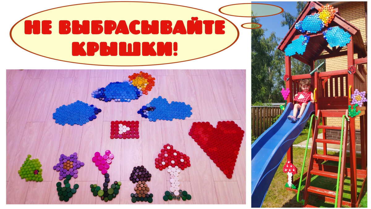 Декор из крышек от пластиковых бутылок. Идеи для дачи и детского сада. Даже из крышек от пластиковых бутылок можно сделать яркий и весёлый декор для дачи, приусадебного участка, детской площадки или детского сада.