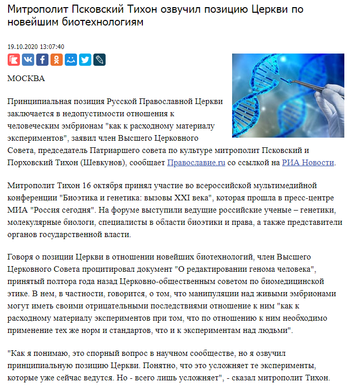 Митрополит Псковский Тихон озвучил позицию Церкви по новейшим биотехнологиям | Радонеж.Ру