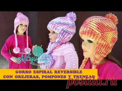 Теплая детская спиральная вязаная шапка с ушками, косами и помпонами шаг за шагом