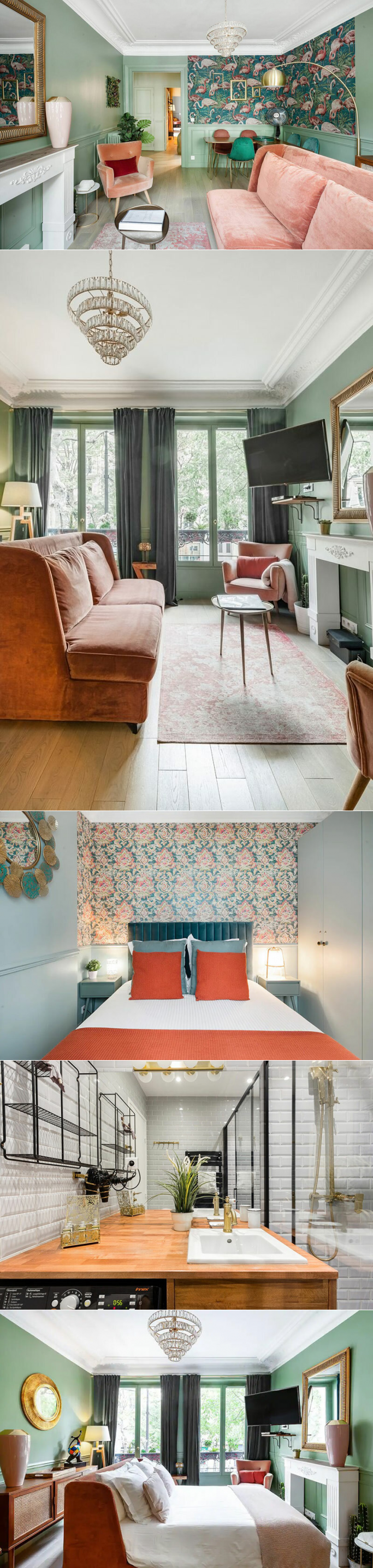 Зеленые стены и розовые фламинго: стильный интерьер квартиры с особенной атмосферой в Париже