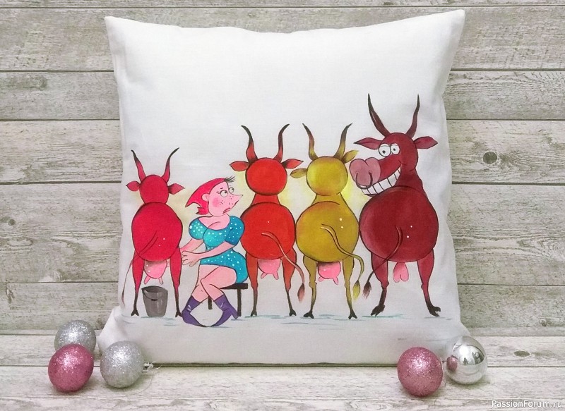 Быкам дорогу!! Подушки с росписью ручной работы ))) | Домашние мелочи своми руками Феечки, снова привет!Бычачье настроение меня опять одолело )) Теперь покажу вам подушки со съемным чехлом, 40 на 40 см, роспись рисунков кистями и текстильной краской. Чехольчик снимается, его можно стирать. На молнии. Сама подушка с наполнителем холлофайбер. Ну и сами рисунки- с...