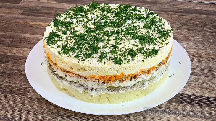 Слоеный салат со шпротами Вкусный слоеный салат со шпротами. Очень похож на закусочный торт.В рецепте указана соль по вкусу, так как по желанию и вкусу каждый слой можно присыпать солью, я же солила только картофель.Рецепт:Шпр...