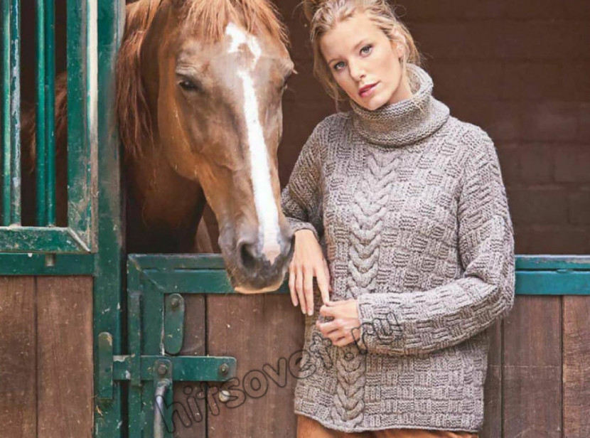 Вязаный свитер клетчатым узором и центральной косой