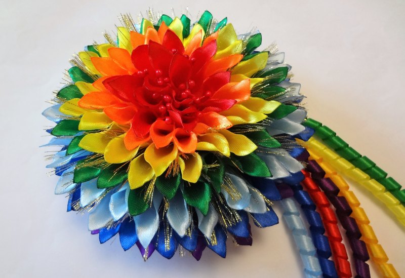 Яркий георгин канзаши из ленты 2,5 см и парчи: мастер-класс с фото