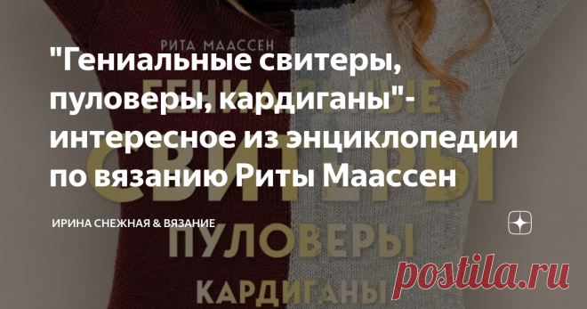 "Гениальные свитеры, пуловеры, кардиганы"- интересное из энциклопедии по вязанию Риты Маассен Если когда-то в руки попали спицы, то это навсегда! Но порой даже опытный мастер не знает с чего начать, но знает точно одно — спицы это не только рабочий инструмент, спицы это Вдохновение!
