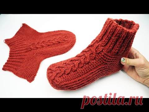 Простые вязаные тапочки с узором. Теплые следочки спицами на холода
