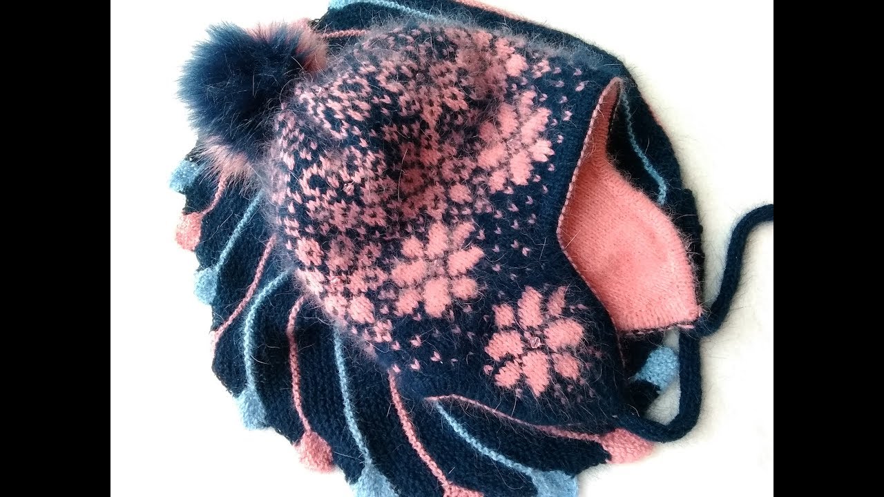 Двойная шапка из пуха норки с жаккардовым узором | Вязание спицами для детей Добрый день, дорогие рукодельницы, везде уже похолодало и наступила время теплых шапок, представляю вашему вниманию шапку из пуха норки, двойну, с ушками, которую я связала для внучки