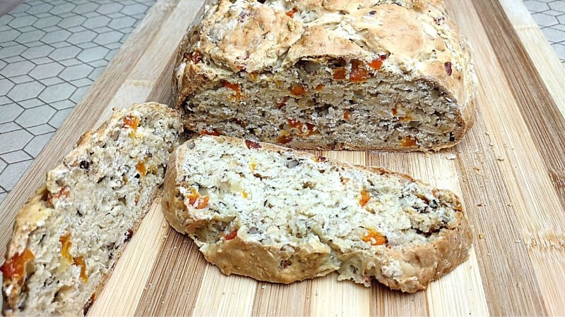Хлеб с орехами и курагой Быстрый рецепт выпечки домашнего хлеба без дрожжей, с грецкими орехами и курагой.Ингредиенты: 400 гр. муки муки,50 гр. овсяных хлопьев,0,5 чайной ложки соли,1 чайная ложка соды,50 гр. кураги,50 гр. грецких орехов,250 мл. кефира,175 мл. молока.Курагу помыть, обсушить и...