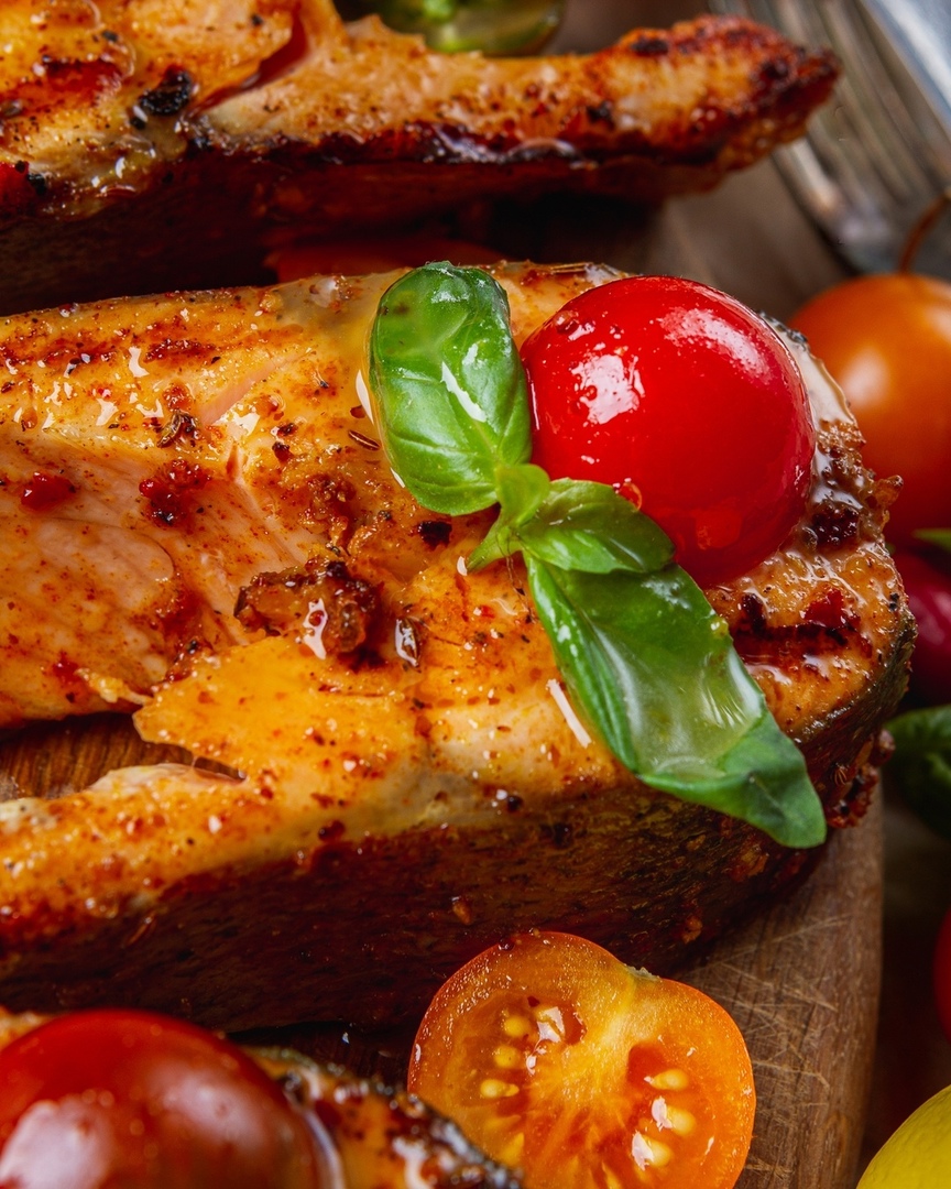 ​Форель с медово-горчичным и авокадо-базиликовым соусом.