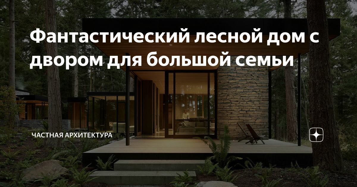 Фантастический лесной дом с двором для большой семьи Дом должен был быть гибким, прочным и способным вместить до 20 человек. Также необходимо «отразить многоуровневую историю как места, так и самой семьи». Расположенный на пологом участке, дом состоит из трёх прямолинейных объёмов, организованных вокруг центрального внутреннего двора. Пересекаемый дорожками, внутренний двор заполнен местной зеленью и окаймлен низкой стеной из местного базальта.
