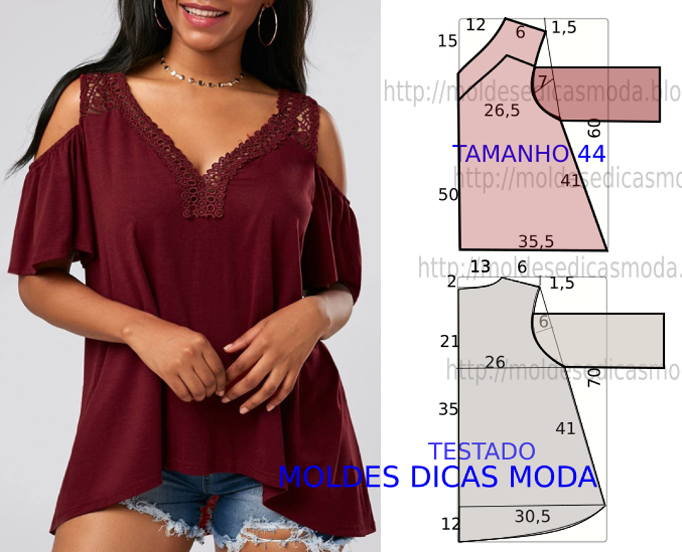 Molde de blusa bordeaux | Moldes Dicas Moda Primeiro de tudo convém relembrar que o molde de blusa bordeaux não tem valor de costura tem que ser acrescentado. Além disso apenas os moldes que são para imprimir têm valor de costura. Assim este modelo é simples e elegante porque favorece todo o tipo de corpos. Finalmente as medidas…