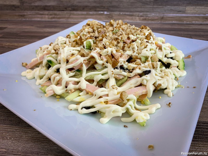 Салат с копченой курицей Салат с копченой курицей и грецкими орехами. Достойный праздничного стола.Рецепт салата:Огурцы свежие — 2 шт.Чернослив — 5 шт.Яйцо отварное — 2 шт.Курица копченая — 250 г.Орехи грецкие — 30 г.Майонез — 100 г.ВИДЕО-РЕЦЕПТ:Приготовление:Курицу, яйца и...
