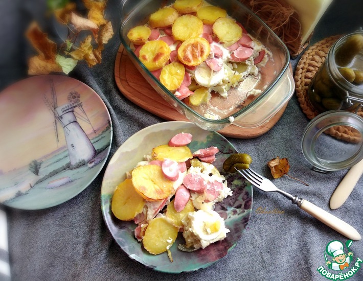 - На яйца - порезанные сосиски. Последний слой - вторая половина картофеля. Делаем заливку. В посуду наливаем молоко, разбиваем яйцо, добавляем сметану и соль по вкусу. Вилкой соединяем и заливаем форму с содержимым. Заливка не должна быть густой. Ставим в духовку, выставив Т-180 С на 25-30 минут.