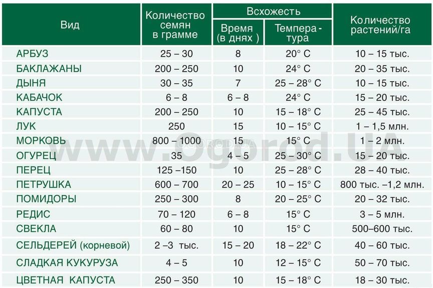 Кол-во семян в 1 гр, срок всхожести семян, температура для всхожести семян, кол-во растений на 1 Га