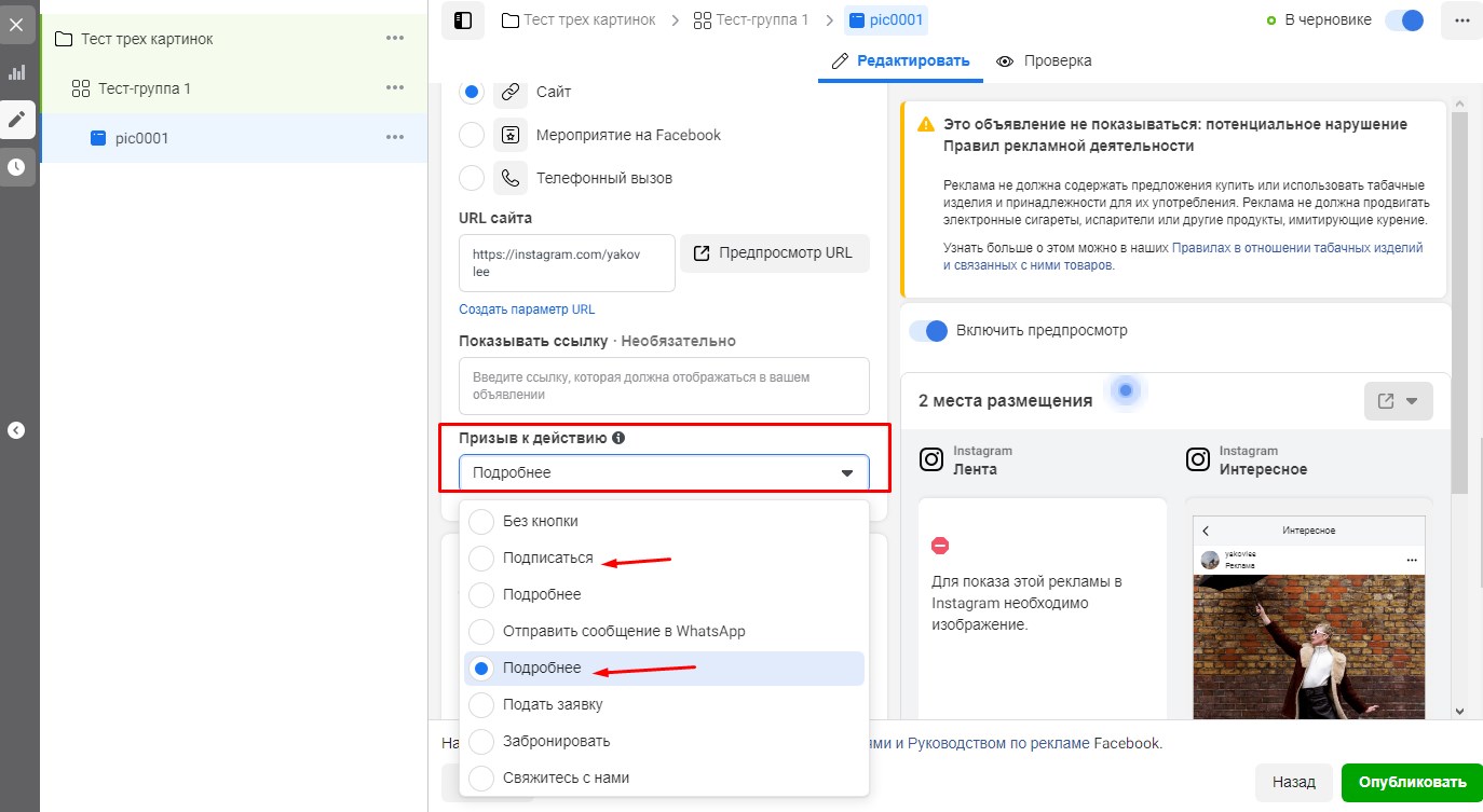 Пошаговая настройка таргетированной рекламы - часть 2 - Администратор в Фейсбуке В прошлой статье мы начали процесс наглядной настройки таргетированной рекламы в Фейсбуке с нуля. Сегодня мы продолжим эту тему уже в этой статье. Теперь выберите название для кнопки призыва. Так как мы ведем людей на Инстаграм, то можно выбрать либо — Подписаться, либо оставить «Подробнее». Все, наш креатив готов. Теперь можно его отправлять на модерацию, […]