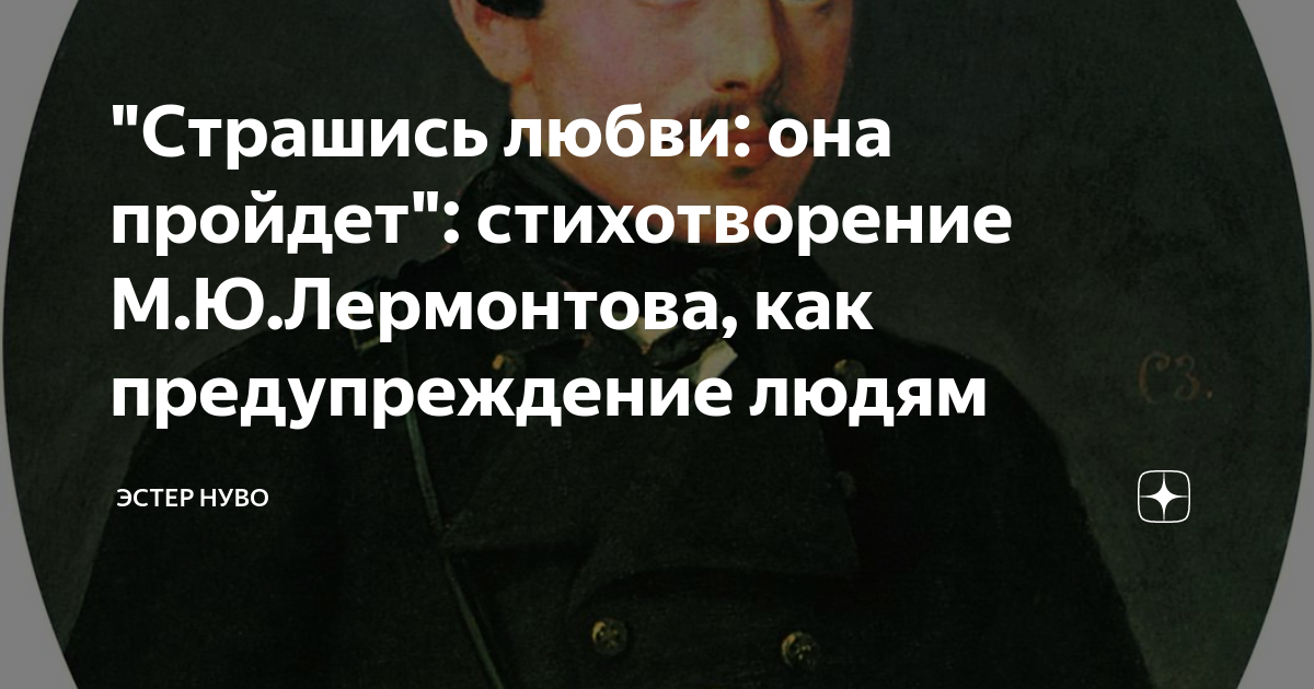 "Страшись любви: она пройдет": стихотворение М.Ю.Лермонтова, как предупреждение людям Я как-то читала, что Михаил Юрьевич Лермонтов был как человек так себе. Завистлив, озлоблен, разочарован в жизни. В прекрасных порывах души искал подвох, чем сам себя и облекал на страдания и депрессию. Но кто из нас святой? И знаете, мне даже нравится тот факт, что Лермонтов не лицемерит. Это большая роскошь вести себя так, как чувствуешь, а не надевать на свое лицо фальшивую американскую