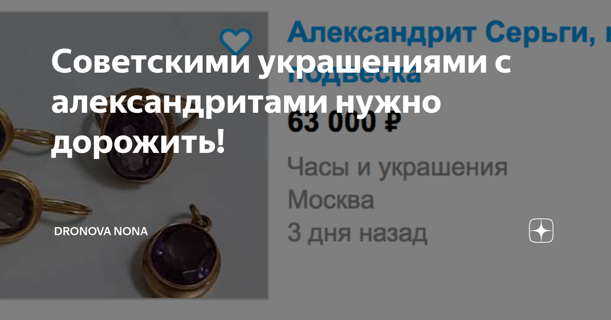 Советскими украшениями с александритами нужно дорожить! Золотые изделия с александритами всегда относились к престижным украшениям. Если кольца или серьги с красными синтетическими рубинами можно было купить достаточно свободно, то серьги и кольца с александритами были в дефиците. Они отличались необыкновенной загадкой. Камень менял цвет от малинового при электрическом освещении до голубовато-зеленого при дневном. Это так красиво. Да и фасоны таких