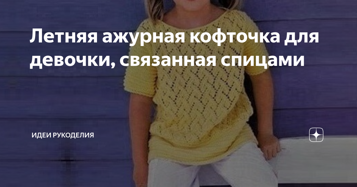 Летняя ажурная кофточка для девочки, связанная спицами Ажурный джемпер с коротким рукавом для девочки связан спицами из пряжи с содержанием хлопка 50 %, он отлично подойдёт для прогулок в жаркую погоду. В нём будет удобно и комфортно, а яркий жёлтый цвет поднимет настроение.