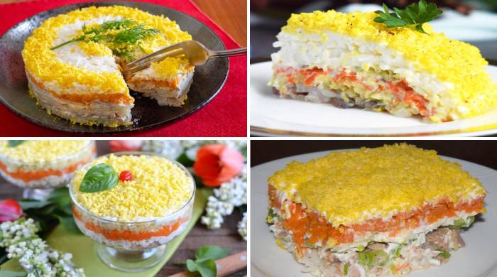 Как приготовить классический салат Мимоза с рыбными консервами, яйцом картошкой. 6 рецептов с тунцом, сайрой, лососем с добавлением риса, сыра