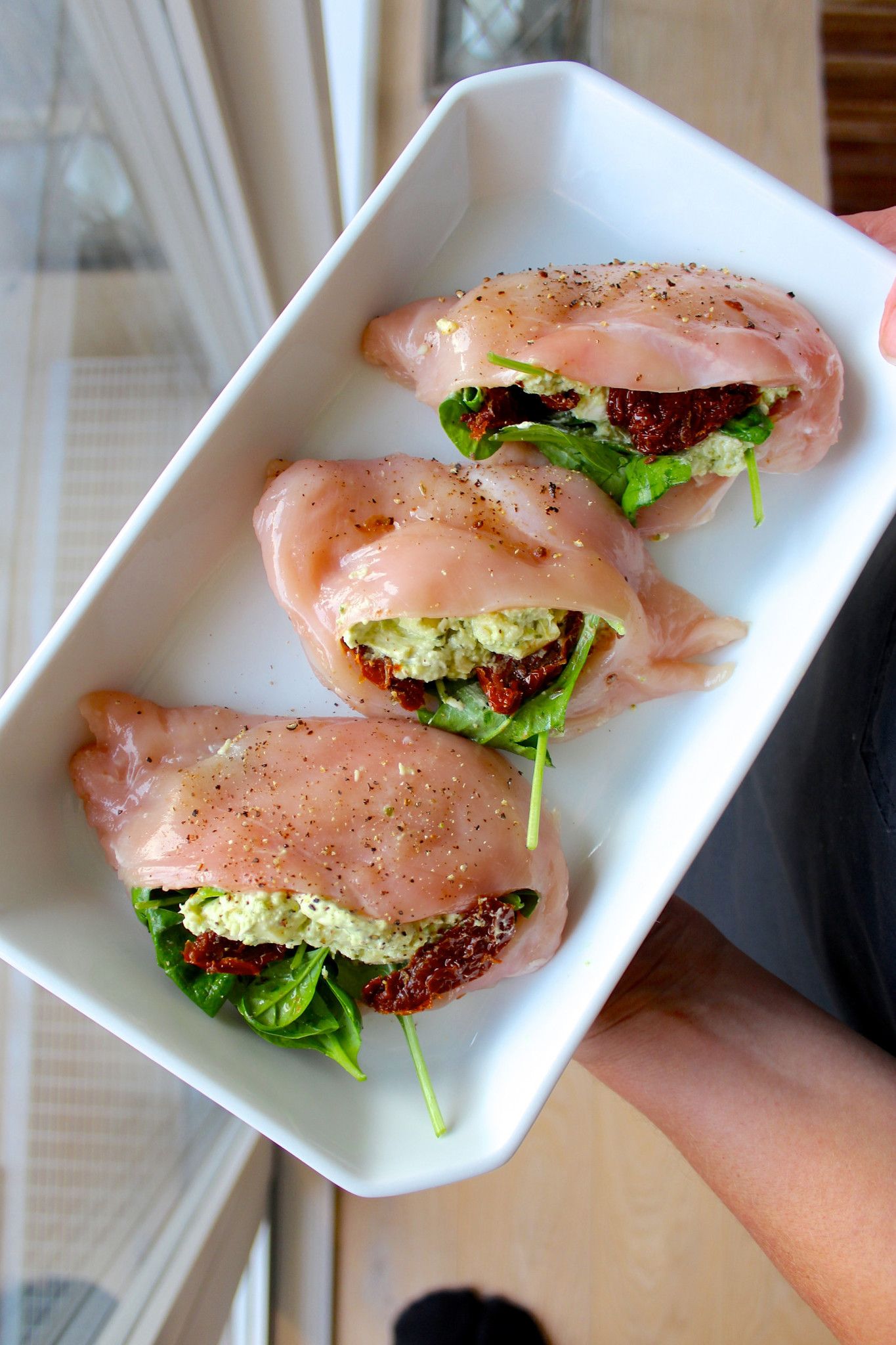 Фаршированная куриная грудка со сливочным сыром, соусом песто и вялеными помидорами