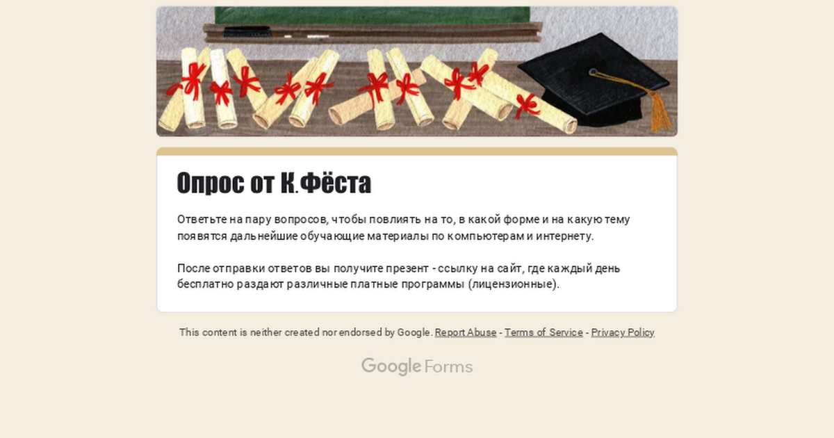 Опрос от К.Фёста Ответьте на пару вопросов, чтобы повлиять на то, в какой форме и на какую тему появятся дальнейшие обучающие материалы по компьютерам и интернету. После отправки ответов вы получите презент - ссылку на сайт, где каждый день бесплатно раздают различные платные программы (лицензионные).