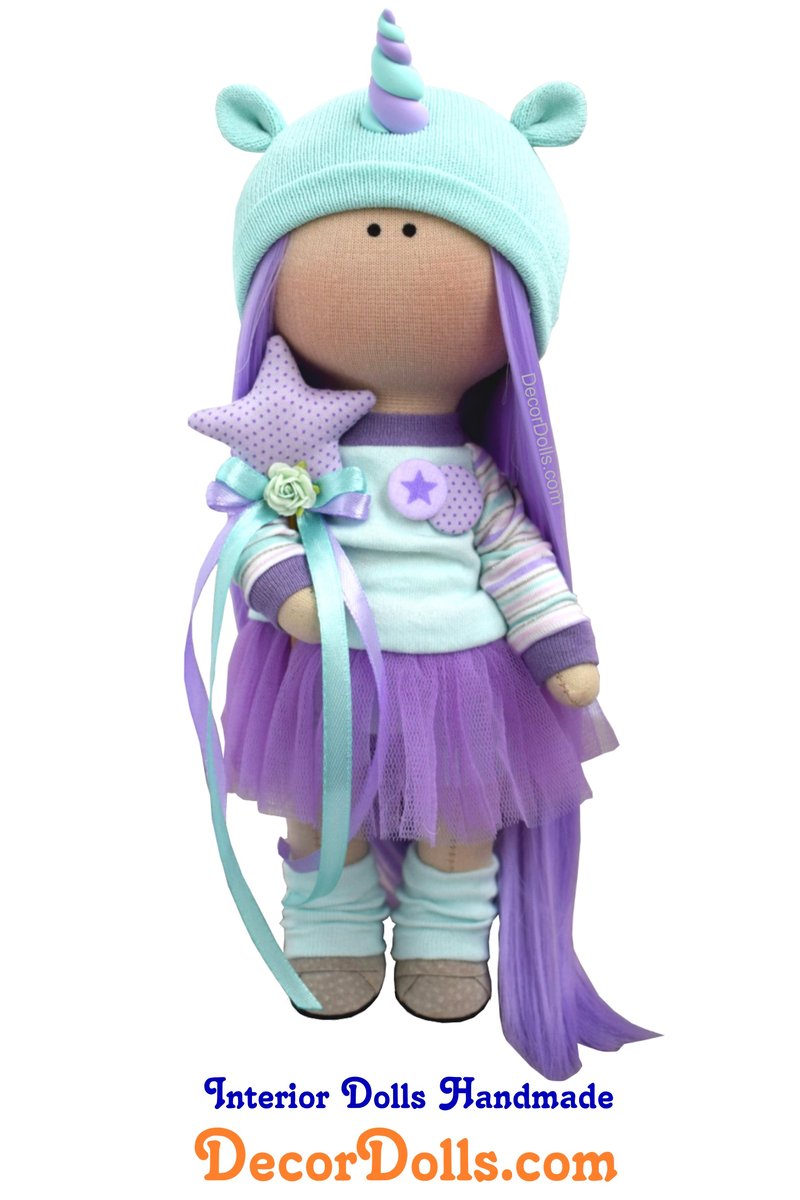 Unicorn Doll Handmade, Nursery Decor Doll, Baby Purple Doll, Tilda Fabric Doll, Textile Soft Doll, Rag Art Doll, Kids Present Doll by Olga G Hello, dear visitors!This is handmade cloth doll created by Master Olga G (Vinnitsa, Ukraine). Doll is made by Order.Order production time is 1-2 weeks. FREE SHIPPING TO ANY COUNTRYDoll is 27 cm (10,6 inch) tall and made of only quality materials.All dolls stated on the photo are made by Olga G.You can find them in our