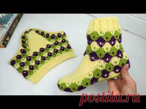 Цветные тапочки спицами с Ромбиками на 37-39р. Как вязать домашние тапочки с цельной подошвой