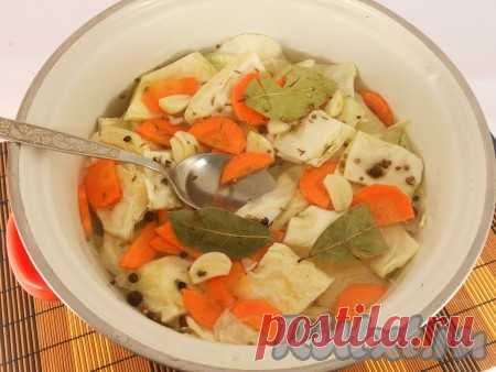 - Капусту нарезать крупными частями. Лучше взять капусту небольших размеров и разрезать ее на 6-8 частей. Если капуста крупная (как у меня) - резать просто крупными кусками. Поместить капусту в кастрюлю. Сверху выложить нарезанную тонкими полукружочками морковь. Сверху капусты разместить лавровый лист, разрезанный на 2-4 части чеснок, добавить перцы черный и душистый горошком, зерна кориандра и тмин. Для приготовления маринада: воду довести до кипения, всыпать соль и сахар, кипятить на слабом огне 2-3 минуты. Влить уксус, дать маринаду снова закипеть и снять с огня. Влить в капусту растительное масло и залить горячим маринадом. На капусту поставить гнет (в моем случае - это литровая банка с водой) и оставить до полного остывания. Далее поместить пелюстку в прохладное место на сутки. Очень вкусную, пряную капусту "Пелюстка", приготовленную без добавления свеклы, можно подавать к столу. Приятного Вам аппетита!