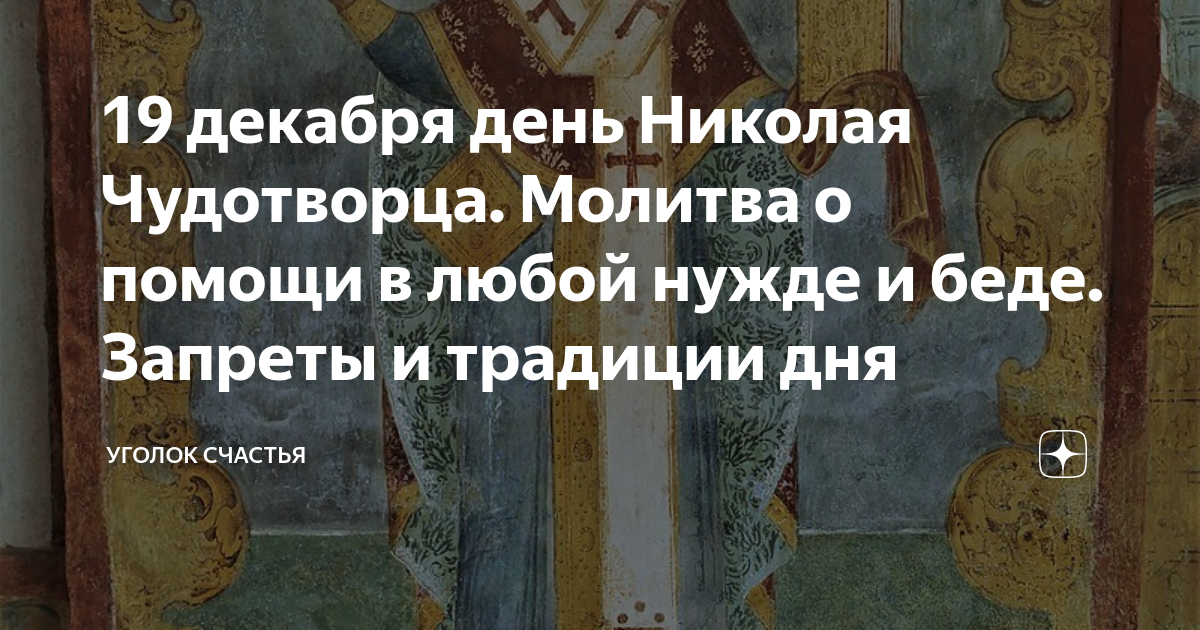 19 декабря день Николая Чудотворца. Молитва о помощи в любой нужде и беде. Запреты и традиции дня Если из всех святых попросят назвать два имени, которые приходят первыми в голову, то это будет Николай Угодник и Матушка Матрона. И эти два человека, святых, сыграли огромную роль в жизни и думаю у многих других, изменив ее навсегда. Для меня Николай Чудотворец - как свет в темноте, который ведет к Господу Богу. И в его день в любимый праздник большинства, мы почтим память, вспомним о его