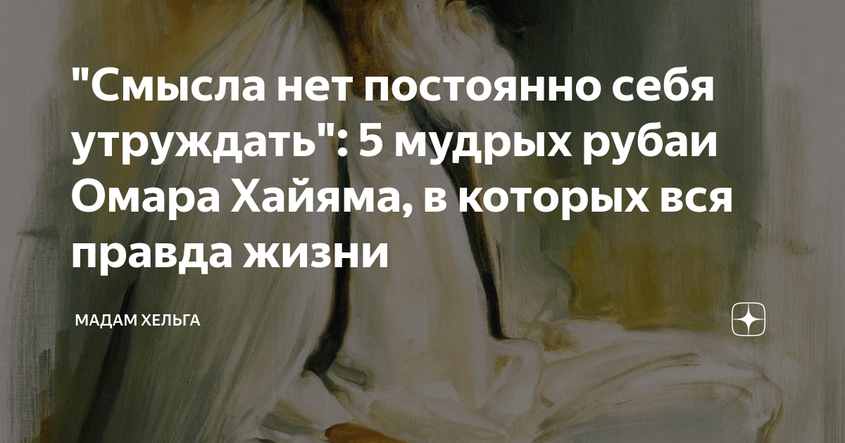 "Смысла нет постоянно себя утруждать": 5 мудрых рубаи Омара Хайяма, в которых вся правда жизни Я не меньше 10 статей посвятила творчеству Омара Хайяма. И кажется, что пора остановиться и перестать эксплуатировать чужую мудрость. Но вот беру книгу "Рубаи" в руки и понимаю, что просто не могу не поделиться с вами лаконичным интеллектуальным совершенством. Тем более, подумать о жизни никогда не помешает. Смысла нет постоянно себя утруждать, Чтобы здесь, на земле, заслужить благодать.