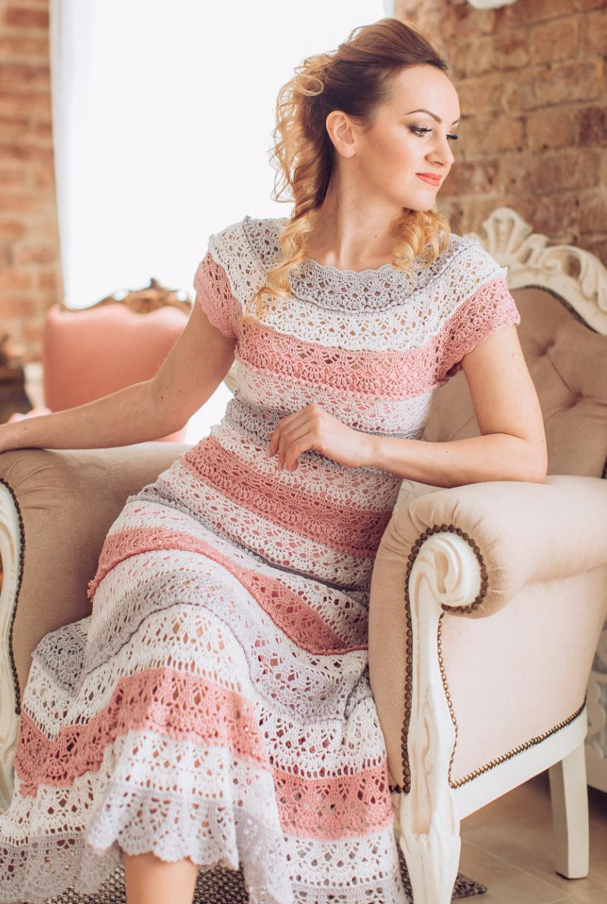 Платье на круглой кокетке крючком красивым узором "Лилия".