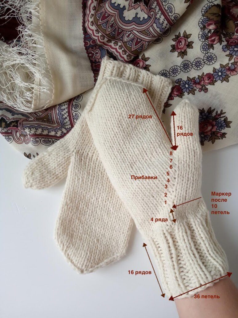 ..в копилочку! Варежки с «анатомическим» пальцем Ход работы Набрать 36 петель +1 для замыкания в круг и вязать резинку 2*2 18 рядов. Затем лицевой гладью 6 рядов. Для правой рукавицы в следующем 7-м ряду лицевой глади после первых десяти петель поставить маркер и после него сделать прибавку скрещенным вправо накидом. Следующий ряд провязать по рисунку. Таким образом прибавить еще 7 петель в каждом втором ряду. Для левой рукавицы маркер ставим после 8-ми петель с начала ря...