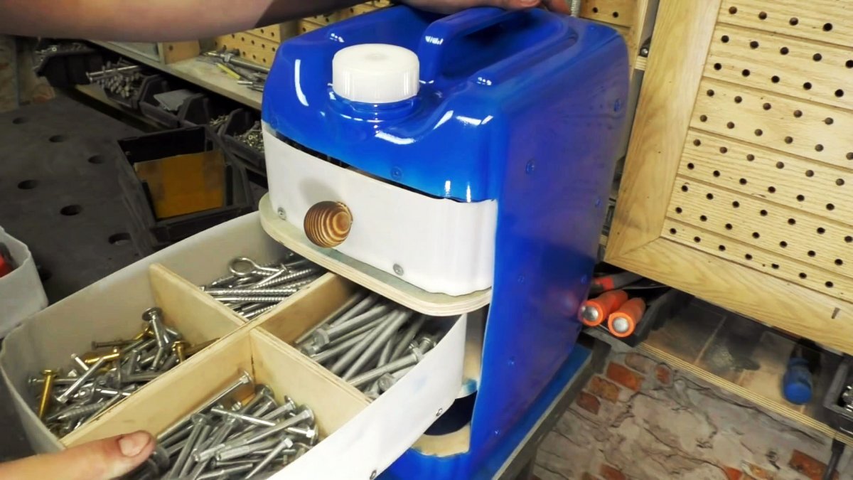 Как всего из 2-х канистр сделать достойный органайзер для мастерской Проблема хранения инструмента и метизов стоит остро для большинства владельцев гаражей или мастерских. Чтобы разложить все свое добро по полочкам, нужно изрядно потратиться на материал для их изготовления. Если средств на обустройство рабочего места не так много, тогда можно сделать отличный
