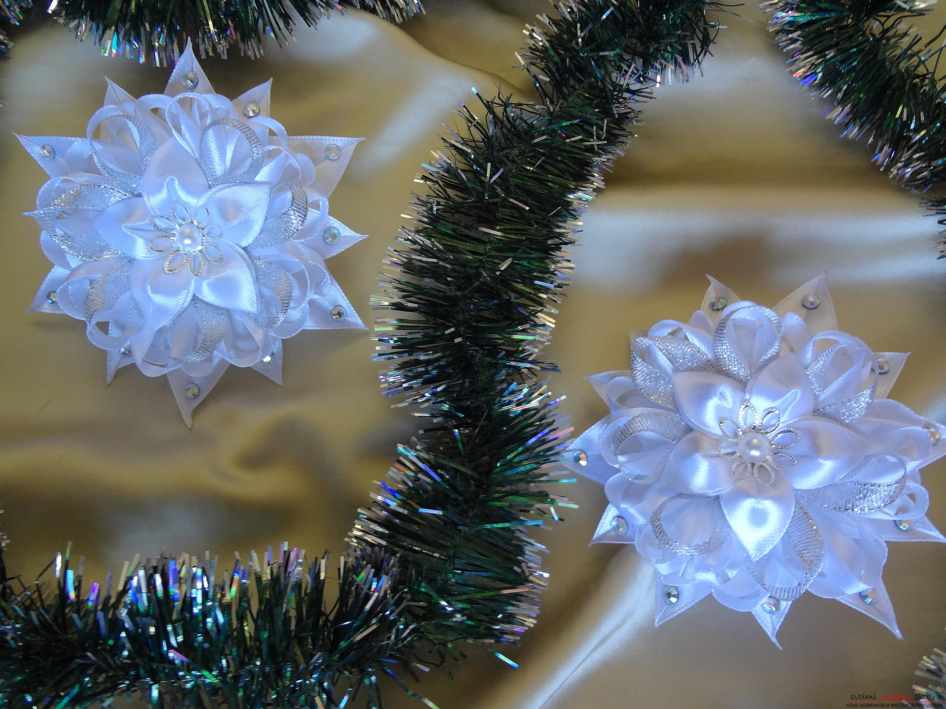 Этот подробный мастер-класс с фото и описанием научит как сделать нарядные новогодние снежинки из атласных лент своими руками в технике канзаши.