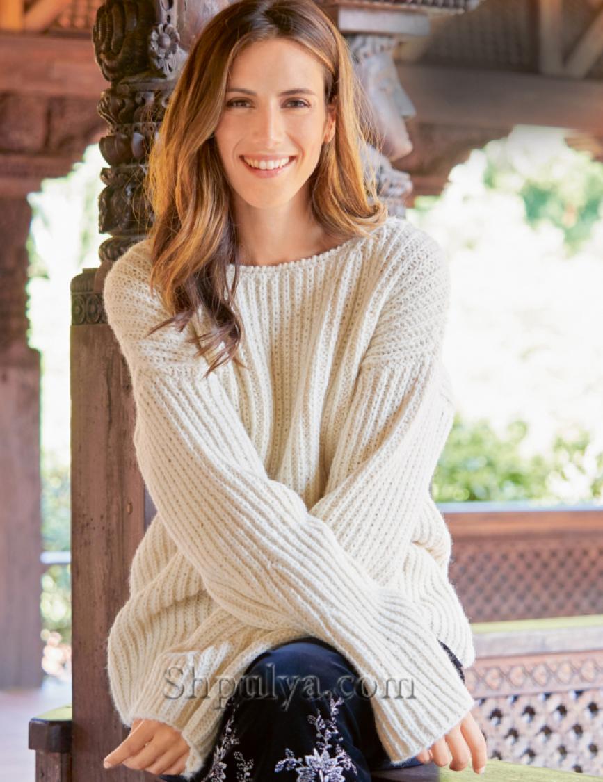 Белый пуловер в рубчик с расклешенными рукавами — Shpulya.com - схемы с описанием для вязания спицами и крючком