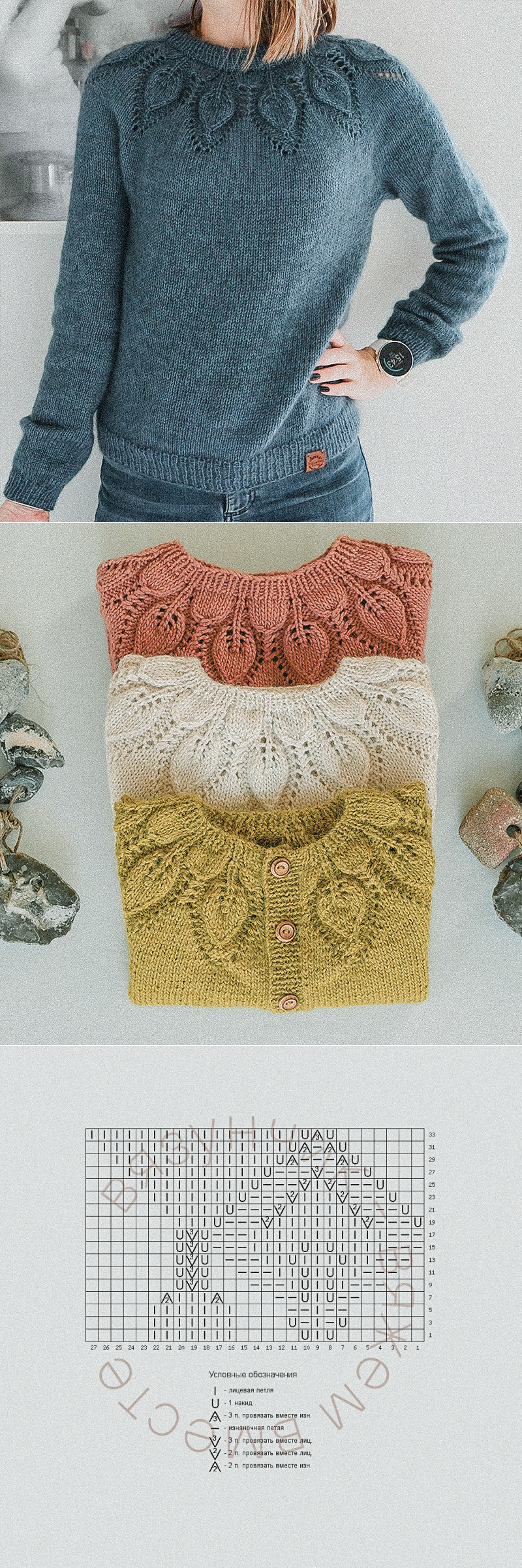 Вяжем вместе! Джемпер с листиками и круглой кокеткой. Схема узора, образцы | Вязунчик — вяжем вместе | Яндекс Дзен