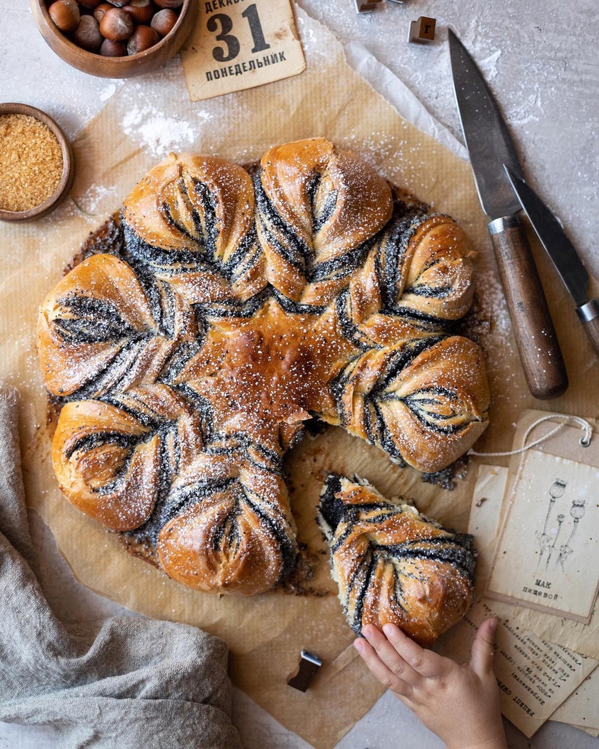 Рождественская звезда с маком Ингредиенты:Для теста:Мука — 450 г Мука — для формовкиМолоко — 200 мл Яйцо — 1 шт. Размягченное сливочное масло — 70 г Сахар — 70 г Соль — 1 щепотка