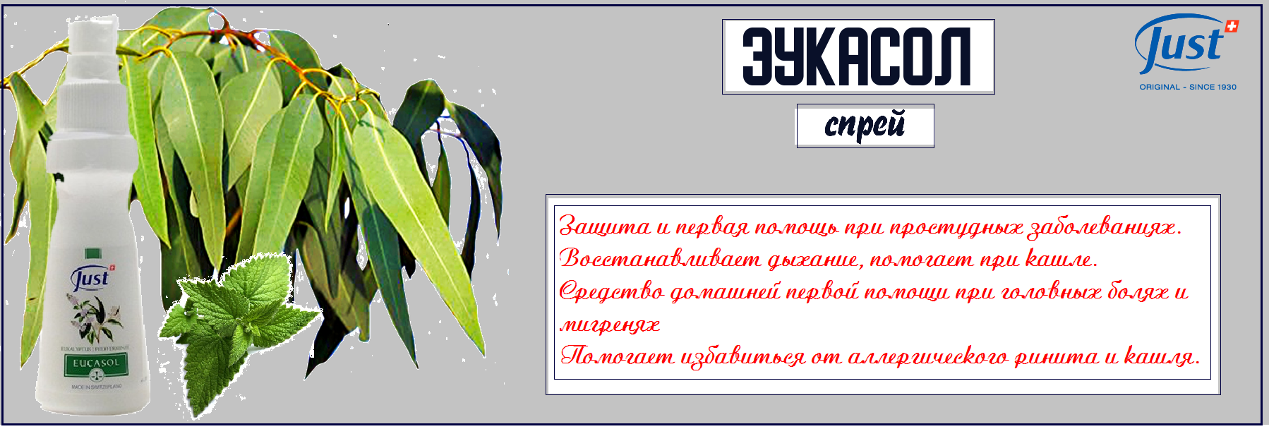 Спрей от вирусов Эукасол создан для облегчения дыхания в городах с повышенной воздуха, для улучшения состояния при бронхо–легочных заболеваниях, применяется как защитное средство во время эпидемий гриппа, используется для профилактики ОРВИ, простуд, бронхитов, синуситов. Помогает нейтрализовать запахи табака, гари, а так же показан людям, чья работа связана с частым воздействием пыли. Увеличивает концентрацию внимания, работоспособность при интеллектуальном труде.
