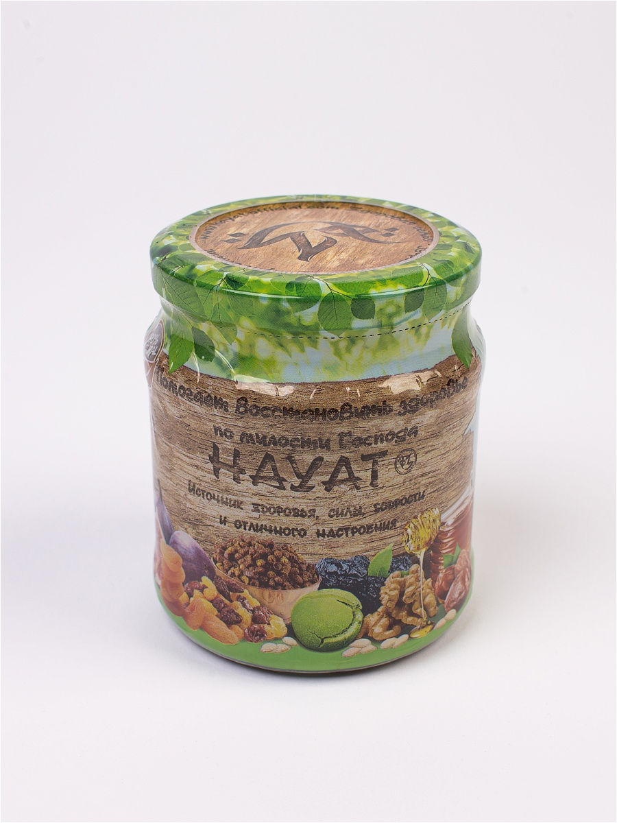 Фруктово-ореховая смесь с медом для поднятия иммунитета HAYAT. 600гр., ХАЯТ Уникальный энергетический комплекс, в котором содержится огромное количество витаминов, полезных веществ, необходимых организму для слаженной работы, энергии, хорошего настроения.Фруктово-ореховая смесь со специями - это абсолютно натуральный продукт, в его составе собрано 12 компонентов, 9 из них упоминается в Коране. Полезное действие смеси на организм сложно переоценить, вкусное угощение укрепля...