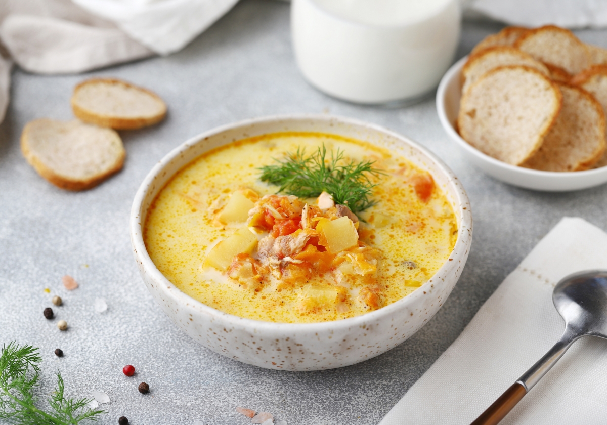 Суп с красной рыбой, томатами и сливками.
