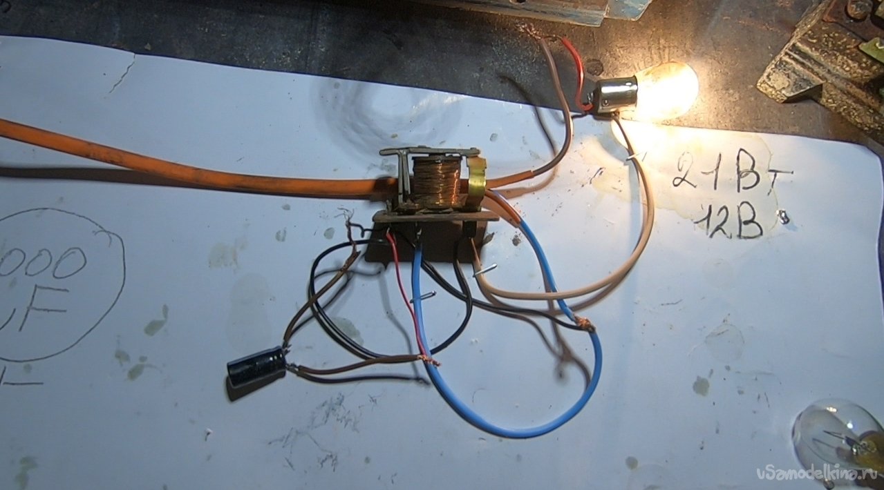 Эксперименты с мигалкой из старинного реле Схема древняя, решил протестировать. Нашел очень древнее реле, два контакта на катушку и два для подключение цепи, включения лампочки в нашем случае. Только вот проблема, обмотка видать замкнута, напрямую реле не подключишь, сильно греется электромагнит. Как итог, даже емкость 3000 uF маловата для